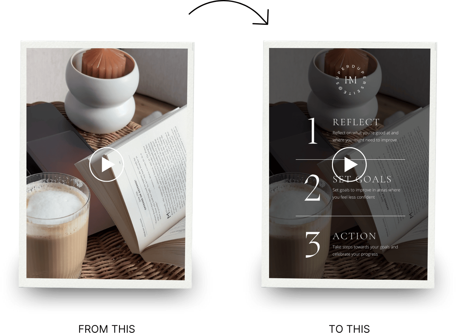 Our 800+ ready-to-use, esthetic trending videos are easy to customize with your colors, text and branding with Canva, Inshot, Capcut or any other editing app of your preference.